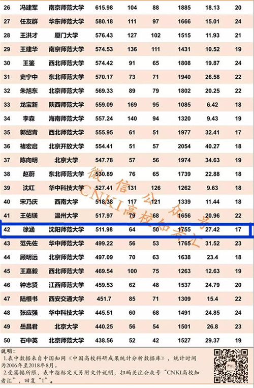 近日,中国知网整理了2006年至今全国高校教育学界学者的中文学术期刊发文、被引情况,涵盖教育学门类下的教育学、心理学、体育学三个一级学科,并分别进行综合排序,推出《全国教育学-学者论文指数排名TOP50》,我院徐涵教授入选。