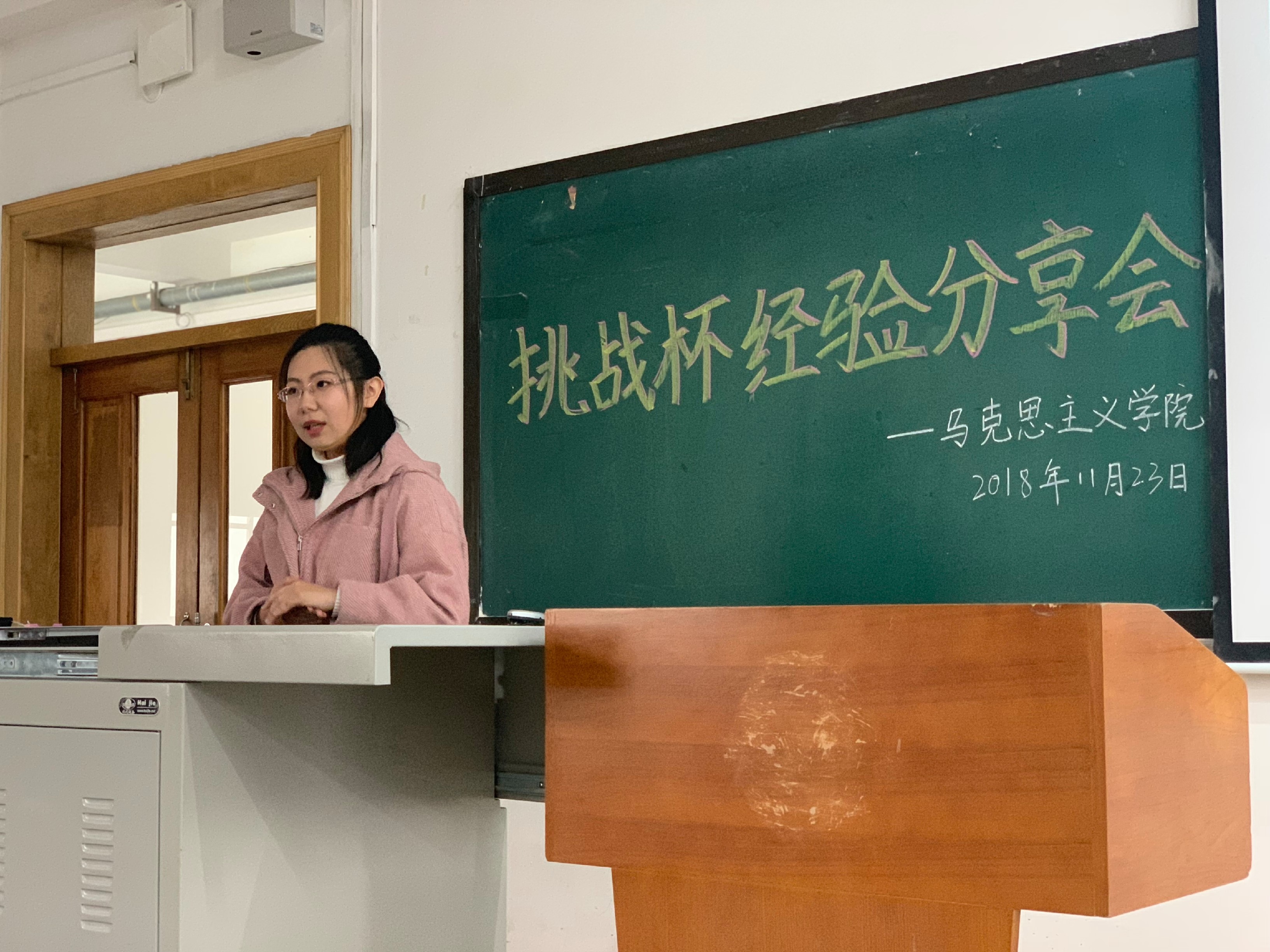 2018年11月13日下午,马克思主义学院挑战杯经验分享会于博文楼104举行。我院2018届教育学专业本科生、2018级课程与教学论专业硕士研究生陈彤应马克思主义学院的邀请作为主讲人,分享其2017年参加第十五届全国挑战杯竞赛的经验。