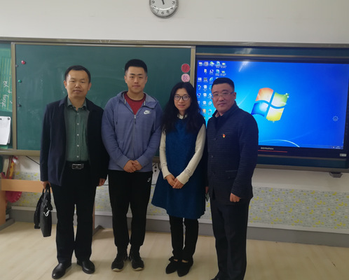 高军老师与实习生代表金雨时、校内指导老师、校长卢大锋合影