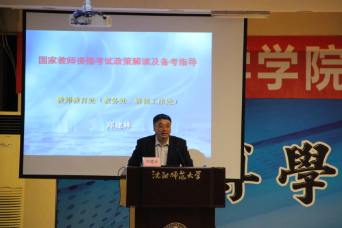 郑建林副处长对近年来国家和辽宁省教师资格证考试政策作了系统梳理和深入解读,强调了教师资格证考试对学生个人职业发展和学校教师资格认证的重要意义,分析了教师资格证考试命题特点、试卷结构以及我校近年来考试情况,并结合自己丰富的工作经历和教学经验列举了多个生动事例。他还以校友“老大哥”的身份和口吻,在教师资格证考试的应对策略和学习技巧等方面为学弟学妹提出了有价值的意见和建议,鼓励同学们增强信心、发挥优势、打牢基础、充分准备,考出荣誉、考出尊严。