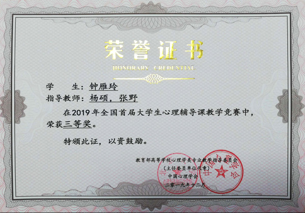 2019年12月,在教育部高等学校心理学类专业教学指导委员会和中国心理学会联合主办的“全国首届大学生心理辅导课教学竞赛”中,我院2016级应用心理学专业本科生钟雁玲同学的参赛作品《学会宽容 善待他人》在学院初评中突围,经过反复打磨、认真准备后,代表学校参赛。近日获悉,经过全国竞赛组委会专家匿名评审,最终荣获全国竞赛三等奖。