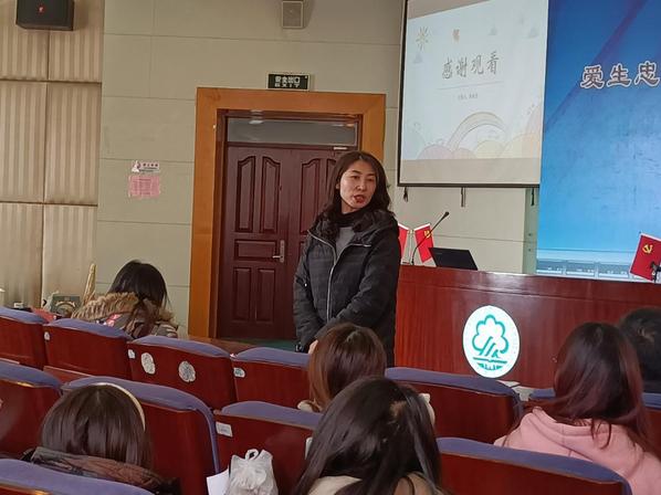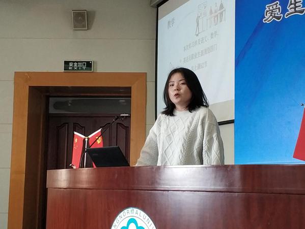 第六个进行分享的是沈阳市化工学校的实习生代表马明爽同学。她向我们介绍了教学工作、班主任工作、行政工作以及特殊收获。该小组在本次实习中涉及语文、数学、英语及职业生涯规划四门科目的教学工作,共计上课52节。在班主任工作中积极学习、认真负责。行政工作设计学生处、教务人事处等层面工作。他们收获满满,为大家播放了多科目的授课画面,让我们看到了一个个努力奔跑在渴望成为优秀教师路上的各位,令人赞叹。