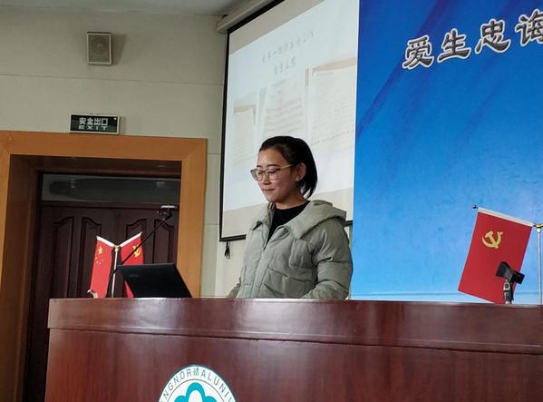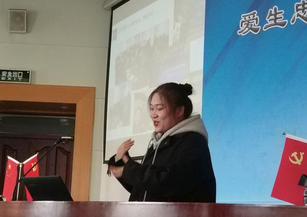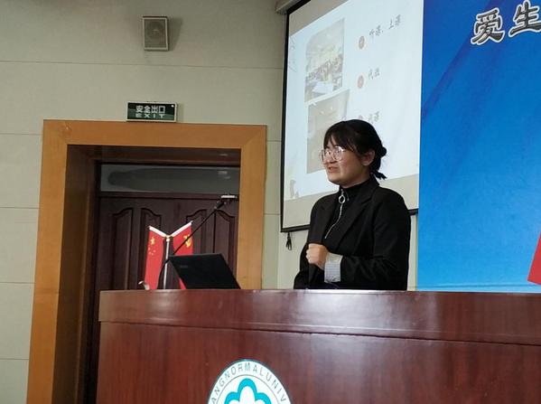 第十一个进行分享的是砂山四校的实习生代表苑胜男同学。她为我们分享了实习地点学校环境、日常工作、参与活动、心得体会。虽然每天需要邹很远的路程,但是她从未觉得辛苦,通过与孩子们的接触、交流,她们相识相知,每每谈起哪些纯真质朴的孩子们,她总是挂着一抹真诚的笑容。
