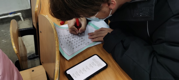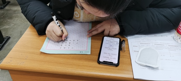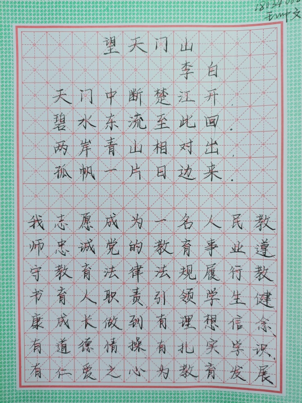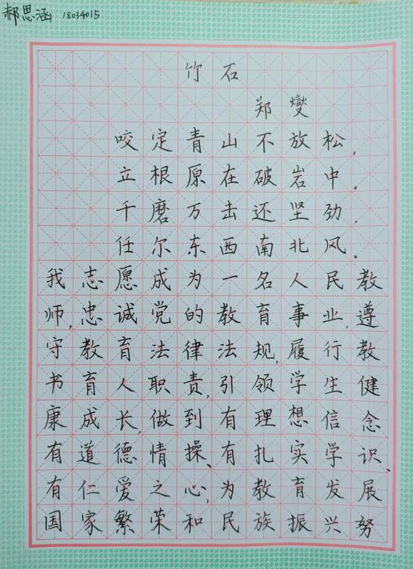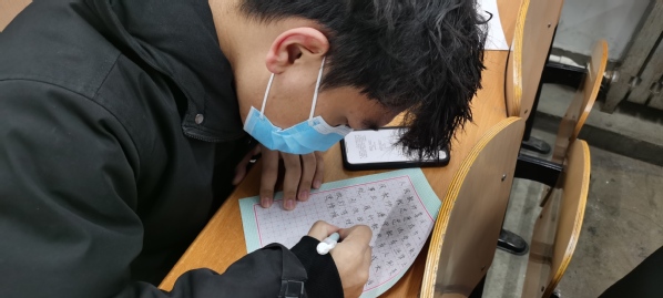 本次考核第一阶段,为钢笔字书写考核,限时10分钟。学生按学号依次在题库中选择一首七言诗进行书写,随后书写“人民教师誓词”,字体不限。