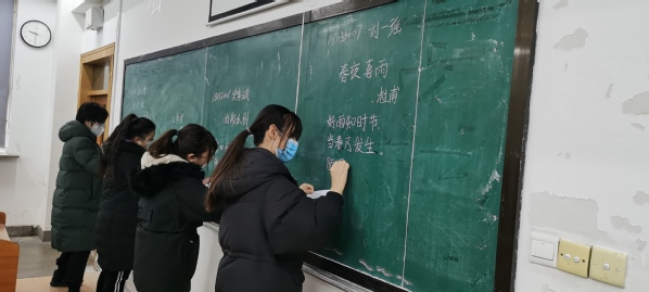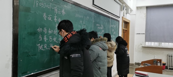 本次考核第二阶段,为粉笔字书写考核,限时5分钟。学生按照学号每四人一组,依次上前抽选一首五言诗进行现场书写。