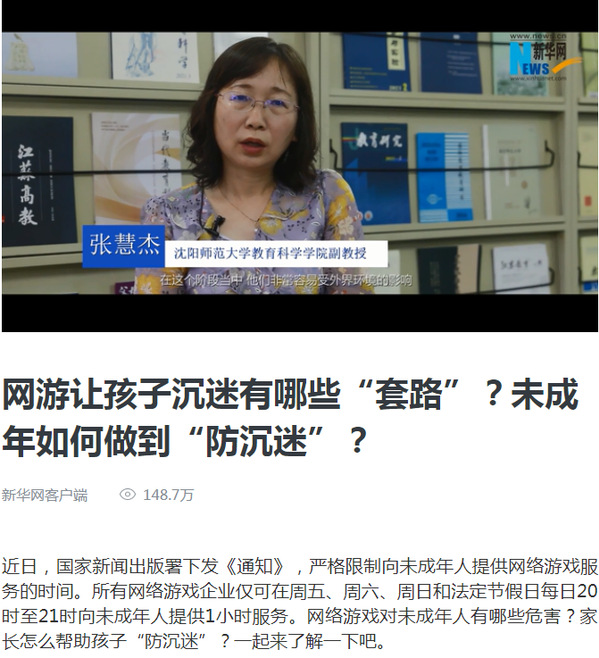 2021年9月6日,针对《通知》要求及未成年人网络游戏使用的状况,新华网采访了我院张慧杰副教授。采访中,张老师从心理学的角度,结合未成年人的心理发展特点,谈了网络游戏对未成年人产生吸引力的主要原因。针对网络游戏沉迷,张老师指出,沉迷网络游戏除了对未成年人的身体健康造成危害,还会给他们的学业发展和心理健康带来负面影响。最后,对沉迷网络游戏未成年人,从学校和家庭的角度,该如何帮助他们“防沉迷”等问题谈了看法。