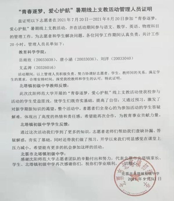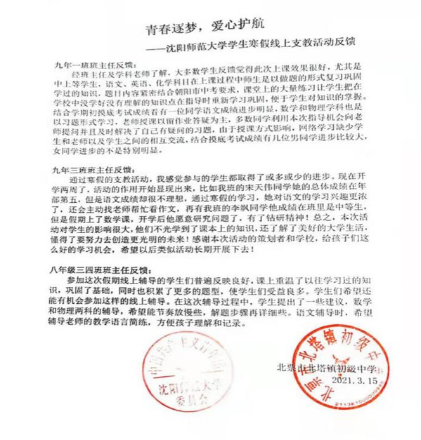 北塔初级中学位于辽宁省北票市北塔镇,师资力量薄弱,教育资源落后。为支援该地区的教育建设,锻炼沈师学子的实战教学能力,弘扬我校之教学风尚,腾博官网诚信为本专业服务研究生和本科生积极策划和进行“青春逐梦 爱心护航”线上支教活动。此次线上支教活动共分为2021年1-2月的寒假支教、2021年7-8月的暑假支教两个阶段。
