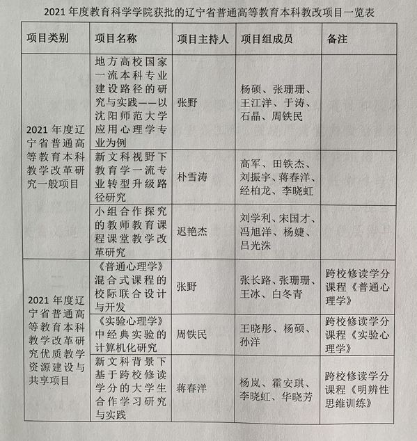 近日,《辽宁省教育厅关于公布2021年度辽宁省普通高等教育本科教学改革研究项目立项名单的通知》(辽教办[2021]254号)发布,我院在今年的省本科教学改革项目立项中取得优异成绩,共获批2021年度辽宁省普通高等教育本科教学改革研究一般项目3项、2021年度辽宁省普通高等教育本科教学改革研究优质教学资源建设与共享项目3项。(详见下表)
