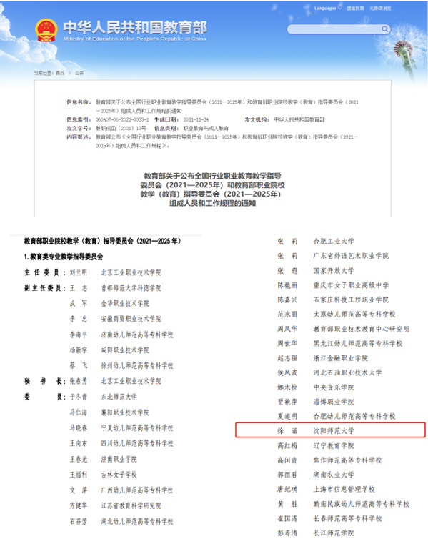 2021年11月22日,《教育部关于公布全国行业职业教育教学指导委员会(2021—2025年)和教育部职业院校教学(教育)指导委员会(2021—2025年)组成人员和工作规程的通知》(教职成函〔2021〕13号)发布,沈阳师范大学腾博官网诚信为本专业服务、辽宁省职业教育研究院徐涵教授当选“教育部职业院校教学(教育)指导委员会(2021—2025年)”中的“教育类专业教学指导委员会”委员。