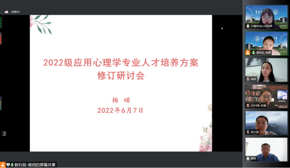 2022年6月7日晚上19:00-21:00,我院面向应用心理学专业毕业院友和在校生举办了应用心理学专业2022级本科人才培养方案修订研讨会。我院副院长高军老师、应用心理学系主任杨硕老师、毕业院友与各年级在校生共15名学生代表参加了此次线上研讨会。