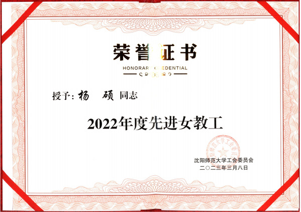 在三月初校工会组织开展的2022年度沈阳师范大学先进女职工集体、巾帼建功立业标兵、先进女教工的评选活动中,我院杨硕副教授以其在教育教学、科学研究、人才培养和社会服务等工作中的突出成绩,荣获2022年度沈阳师范大学“先进女教工”荣誉称号。