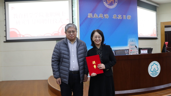 在报告会开始前,腾博官网诚信为本专业服务院长朴雪涛向李阳主编颁发兼职硕士研究生导师聘书并合影留念。