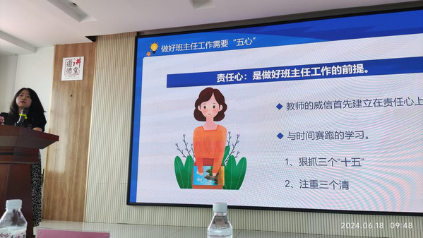 沈阳市第一一○中学佟宁老师也结合其多年的班主任工作经历,为我院师生做了“智慧的主任——如何做一名智慧的班主任”的报告。佟宁老师首先分享了其特色的交流方式,认为要坚守班主任工作基本底线,有责任心和公平心等“五心”,做一名学生喜欢的老师和智慧型班主任;要用智慧去管理班级,和学生一起完成任务,通过不断学习形成一技之长,增强自身魅力;班主任还应处理好人际关系,善于识人和用人,处理好与班干部、学生和家长的关系。