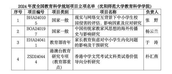 全国教育科学规划课题本年度共立项474项,其中国家社科基金教育学项目361项,教育部级年度项目80项、专项33项。我校共获批7个项项目,其中国家一般项目4项、教育部青年项目1项、教育部专项2项。