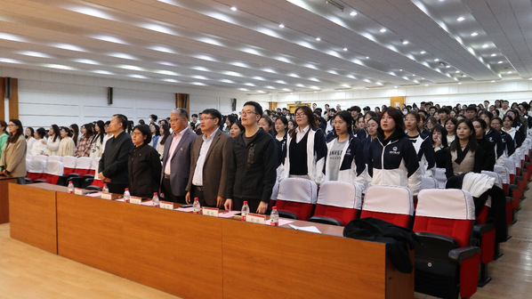 在党委副书记郑欣的主持下,庄严肃穆的开学典礼拉开了帷幕。整齐而有力的歌声响起,大家齐唱国歌,凛然挺立,表达对祖国的深深热爱和敬意。