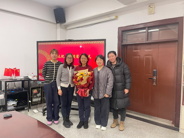 李春光和刘学利老师为迟艳杰老师献花