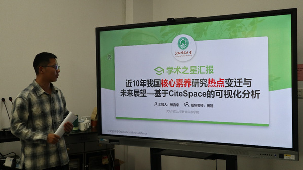 第二场由杨言京同学作了题为《近10年我国核心素养研究热点变迁与未来展望--基于CiteSpace的可视化分析》的报告。他基于中国知网应用CiteSpace对2014年至2024年核心素养的相关文献进行可视化分析,结果得出核心素养研究形成了核心素养与课程改革、学校教育与开放性实践、信息时代教育转型三大主题8个子领域的热点变化趋势。结合图谱发现核心素养的研究聚焦于课程改革、学习评价、信息时代等。指出未来研究可从更新核心素养的内涵、构建核心素养研究团队、拔高核心素养研究深度三方面入手。