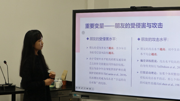 第一场由李家仪同学作了题为《青少年攻击行为与同伴侵害关系及其转变模式》的报告。报告中提到:青少年攻击行为备受社会与心理学界关注,众多研究表明,同伴侵害是引发青少年攻击行为的关键风险因素。遭受同伴侵害的青少年易将攻击者视为具有敌意,并将这种认知泛化到整个同伴群体,致使其在后续人际交往中更易出现攻击行为。研究证实,青少年受侵害与攻击兼具稳定性与转变性,且转变模式多样。随着时间推进,个体的同伴侵害身份会发生改变,而这种转变受多种因素共同影响。报告综述了最新成果,从动态变化视角深入剖析二者复杂关系及转变模式,为青少年心理健康教育与行为干预提供了重要参考。